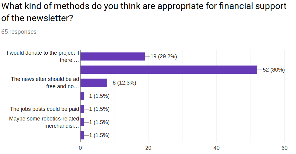 In the issue #32 of Weekly Robotics Newsletter we made a short survey. This post shows the survey results and discusses them as well as the current state of the Weekly Robotics and what’s ahead for this project.